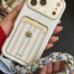 قاب موبایل آیفون مشکی بند زنجیری بلند بالشتی پروانه ای جاکارتی دار