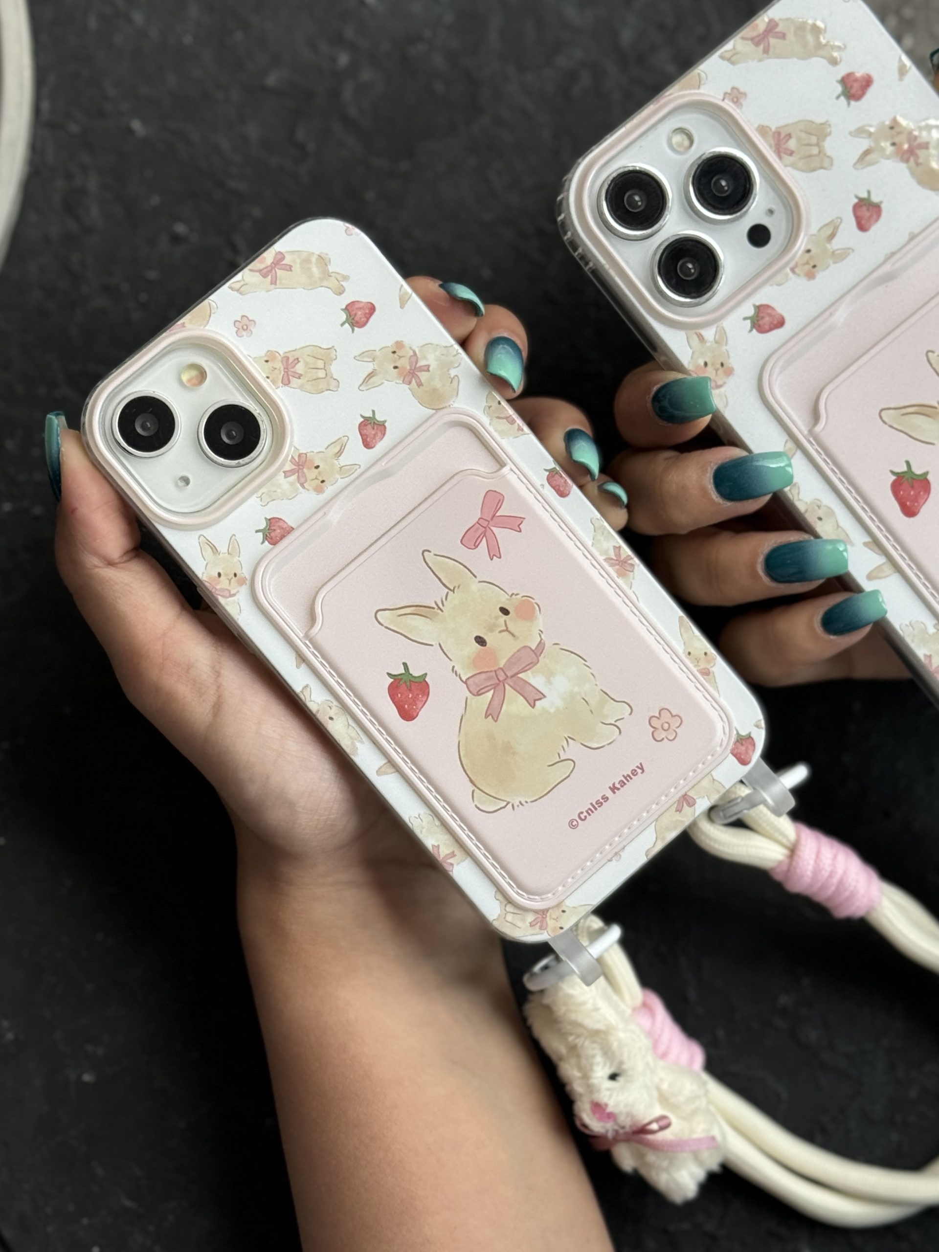 قاب موبایل آیفون خرگوش توت فرنگی پاپیون آویز و بند عروسکی