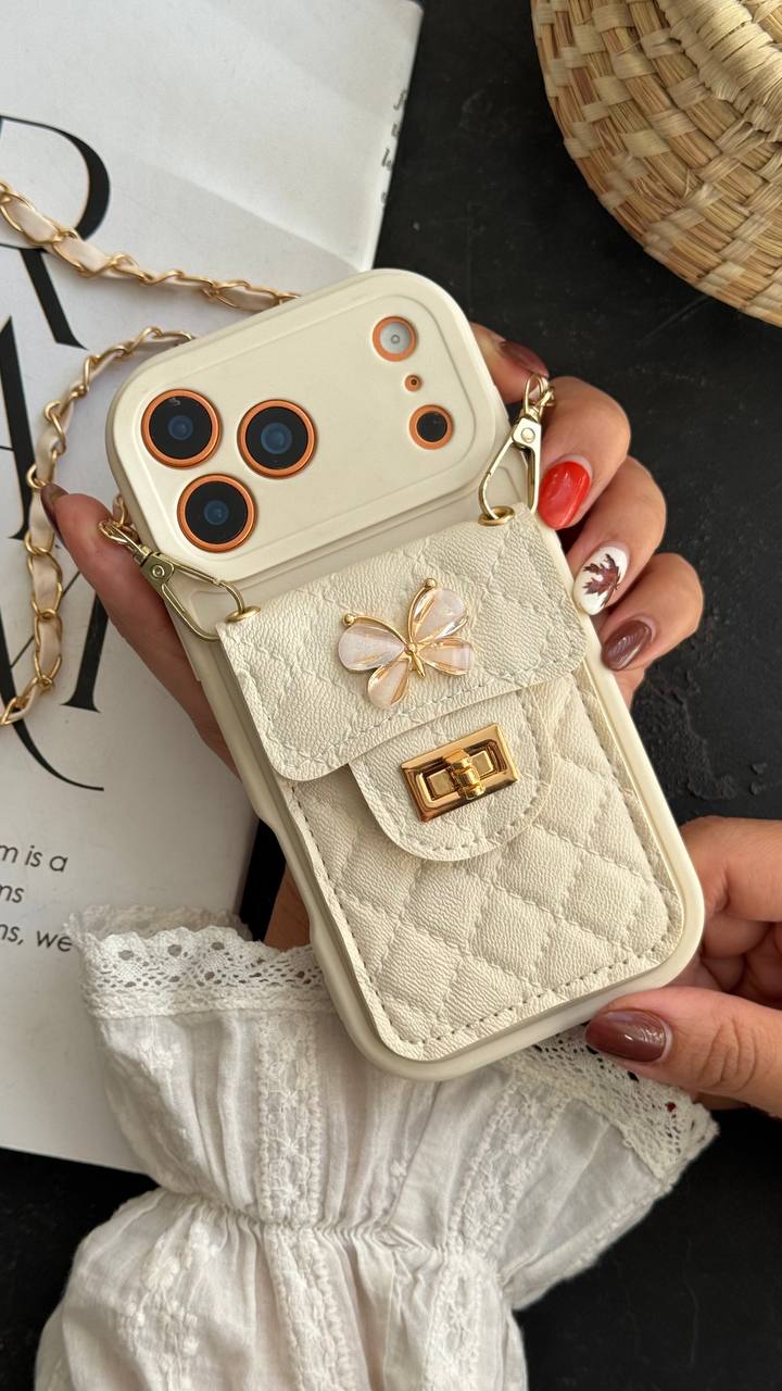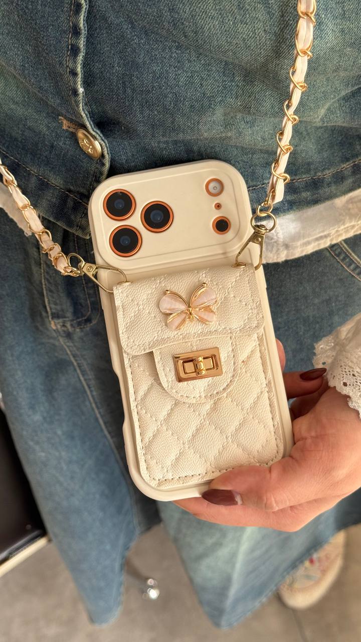 قاب موبایل بند زنجیری پروانهای جاکارتی دار دارای جاکارتی کاربردی در پشت خود است که به شما اجازه میدهد کارتهای بانکی یا کارت مترو را همیشه همراه داشته باشید. درب محفظه با قفل طلایی کوچک و شیک بسته میشود که ضمن زیبایی، امنیت کارتها را تضمین میکند.