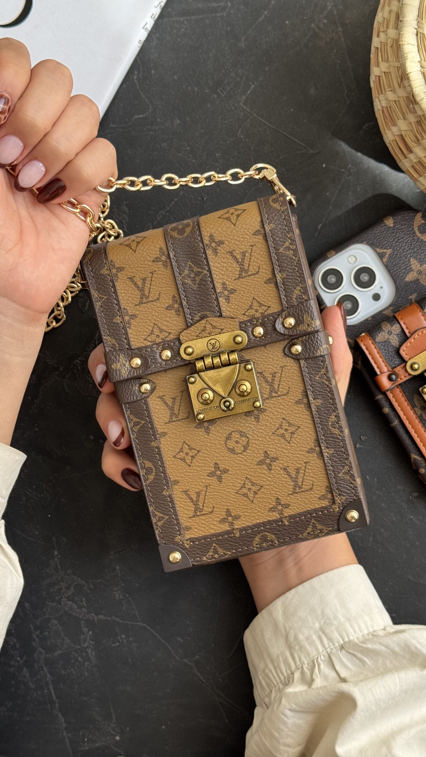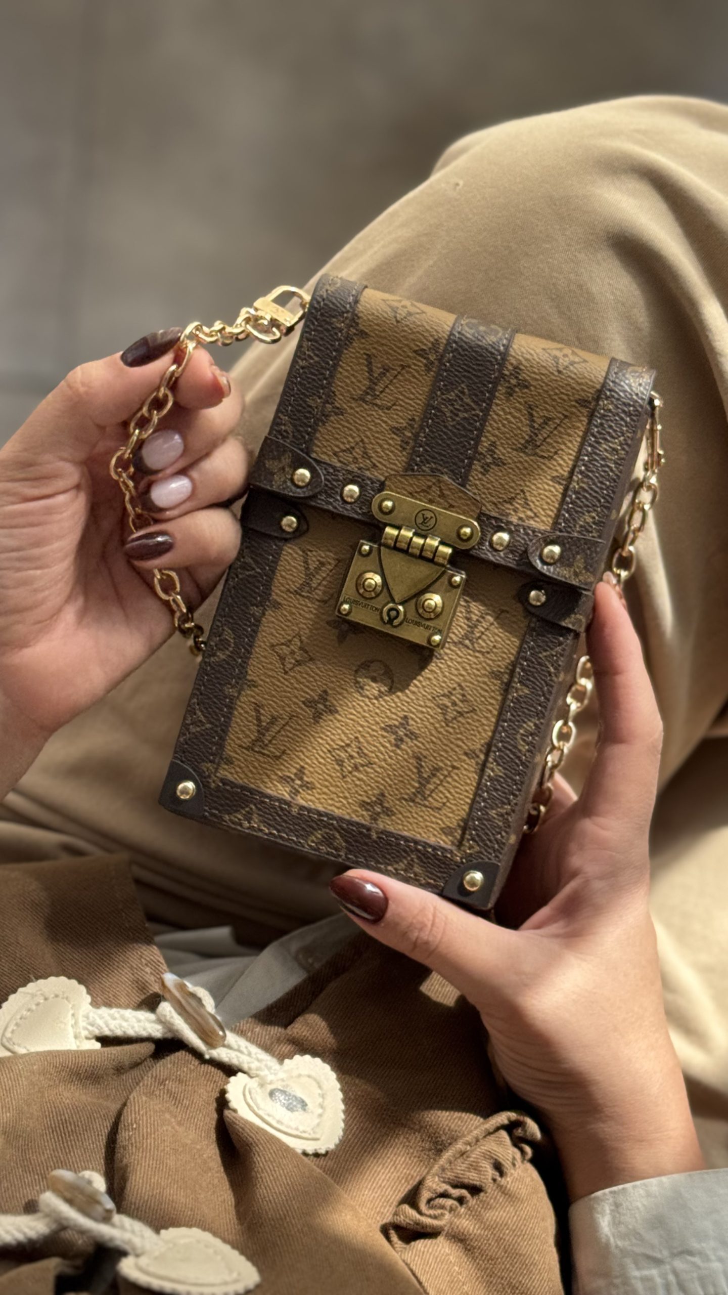 کیف فری سایز لویی ویتون صندوقی بند زنجیری با الهام از سبک صندوقچههای قدیمی طراحی شده و در عین حال ظاهری کاملاً مدرن و لوکس دارد. این کیف خاص با دو رنگ قهوهای و طلایی و لوگوی برند معروف LV، حس اصالت و تجمل را به استایل شما اضافه میکند. طراحی صندوقی آن باعث میشود ساختار کیف کاملاً منظم و مقاوم باشد و از لوازم داخل بهخوبی محافظت کند.